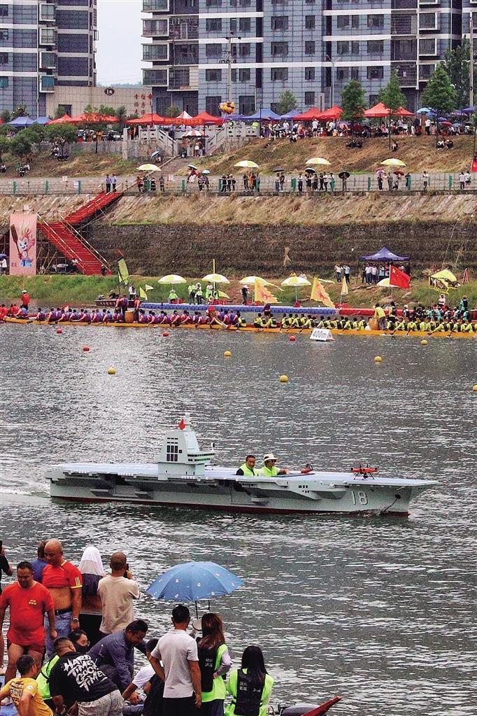 “看,‘航母’來了!”“今天就是特意趕過來看‘航母’的,太棒啦!”6月10日,在湘西州瀘溪縣舉辦的“村舟”傳統龍舟大賽現場,一艘氣勢雄渾、造型逼真的航母模型船破浪而出,引起現場觀眾一陣歡呼。