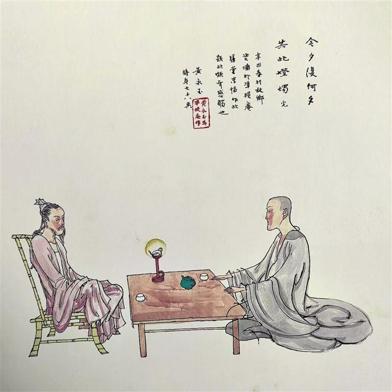 壁畫最后一幅,畫中兩個(gè)人物,一僧一俗,相對(duì)而坐。中間條案上一盞油燈,一壺二杯,隔桌對(duì)飲。讓人感覺(jué)畫中茶水飄起的清香和閃跳的燈光融合在一起,兩個(gè)人的心境在安然寧?kù)o中息息相通,凡塵世界與禪宗境界在溫暖的燈光里相對(duì)相處。題跋是“今夕復(fù)何夕,共此燈燭光”。這詩(shī)意的感懷,似乎是先生把自己置身于畫里,暗示畫這批壁畫的機(jī)緣。而那盞如豆的燈火,似乎因?yàn)橄壬狞c(diǎn)亮而閃耀著人文精神的光芒。