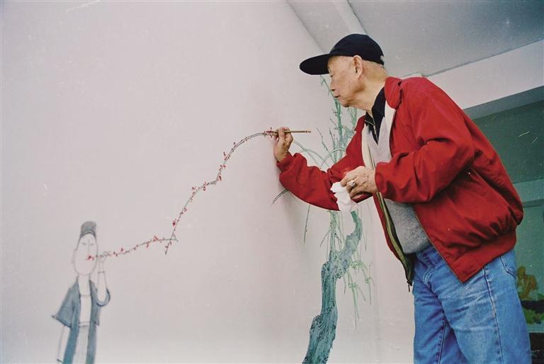 先生時(shí)年七十有八,爬上爬下,在桌子上站著畫,坐著畫,踮起腳尖畫,跪在桌面畫,不時(shí)更換姿勢(shì)。起坐的是一把小木靠椅,吃的是住持送至膳堂的齋飯,工作量和體力消耗極大,一天下來(lái),手軟腳麻,腰酸腿疼。墻壁原本是888涂料,未做過(guò)專門處理,行筆走墨,顏料浸染,與宣紙畫布瓷板都不同,先生畫時(shí),并無(wú)草稿,每畫一筆,皆干凈利索,可見(jiàn)他早已深思熟慮,成竹在胸。
