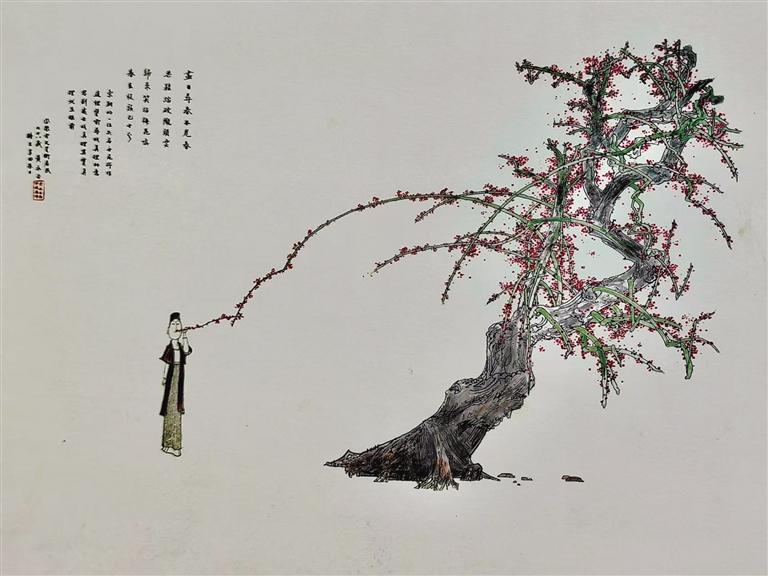先生登高作畫,一樹(shù)古梅,花開(kāi)燦爛。