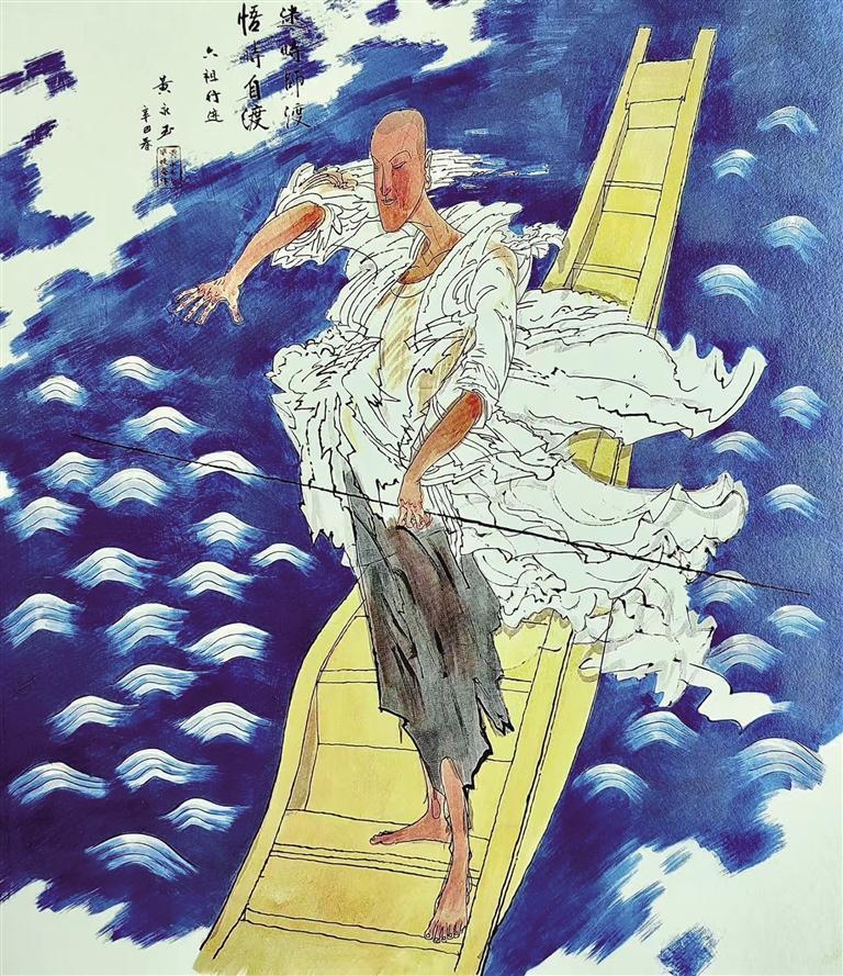 畫慧能三幅:一為于江湖之上,手持竹篙,劃一扁舟,題“迷時(shí)師渡,悟時(shí)自渡”;一為避難與獵人為伍,放生所獲獵物,共餐時(shí)“但吃肉邊菜”;一為神秀、慧能關(guān)于菩提鏡臺(tái)“有”與“無(wú)”的辯答,偈語(yǔ)詩(shī)外補(bǔ)題“菩提樹(shù)鏡臺(tái)塵埃原都是實(shí)在的東西,連你慧能都是物本身,硬說(shuō)它無(wú)是說(shuō)不過(guò)去的”。