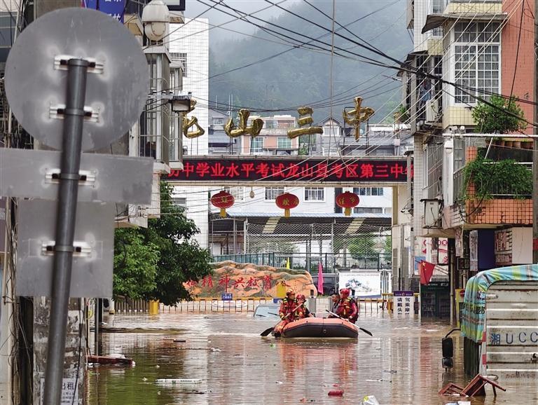 6月19日,龍山縣第三中學校園水位不斷上漲,縣消防救援隊立即啟動搜救行動。 姜長春 田力 攝