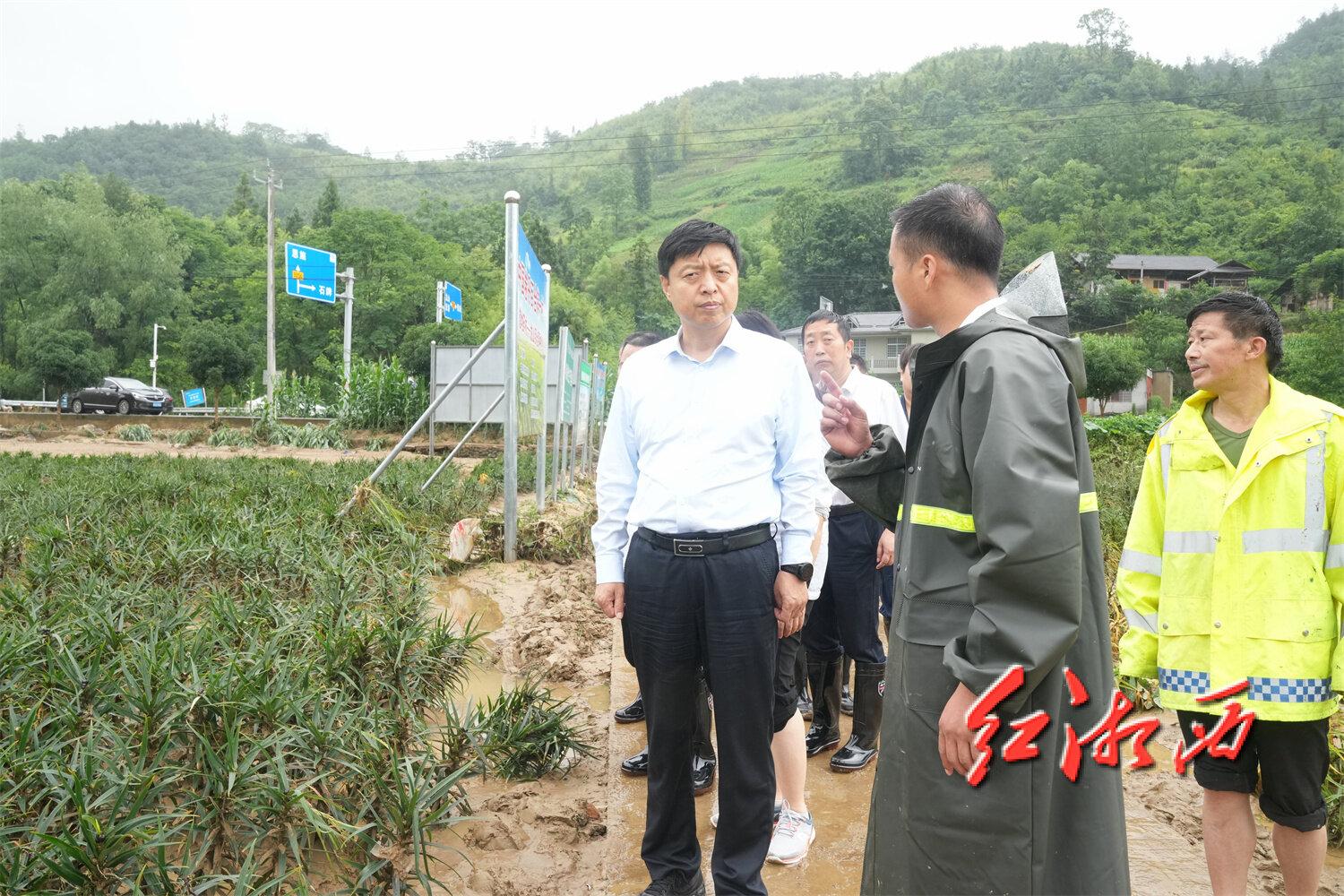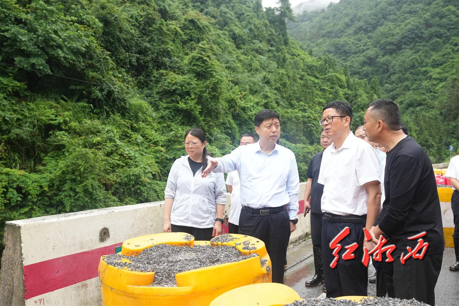 劉濤到龍山縣興隆街道響水洞村查看水毀路基搶修情況。團(tuán)結(jié)報全媒體記者 劉煒 攝