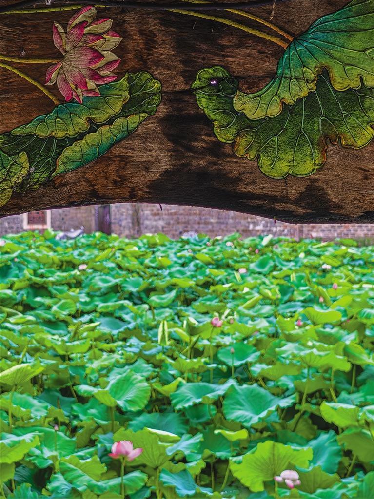 “出淤泥而不染,濯清漣而不妖”讓荷花成為“君子之花”;觀音菩薩坐蓮臺(tái)、哪吒以蓮藕重塑肉身等諸多傳說(shuō)故事,又為荷花賦予獨(dú)特內(nèi)涵。胡家塘旁有一個(gè)小小的土地堂,煙火綿延,守護(hù)著古城,也守護(hù)著魚(yú)兒在荷下穿梭、青蛙在葉上歡鳴、麻雀驚起蜻蜓亂舞。