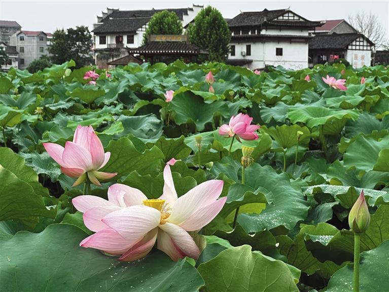 萬(wàn)荷園的荷,背景是黛瓦白墻的徽派建筑,氤氳了江南水鄉(xiāng)的溫婉多情。團(tuán)結(jié)報(bào)全媒體記者 石健 攝