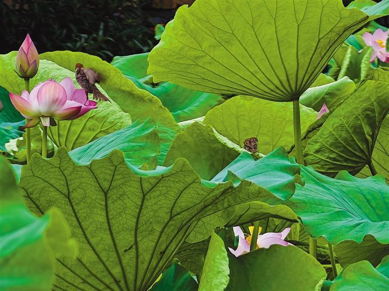 鳥(niǎo)戲動(dòng)新荷。 團(tuán)結(jié)報(bào)全媒體記者 張謹(jǐn) 攝