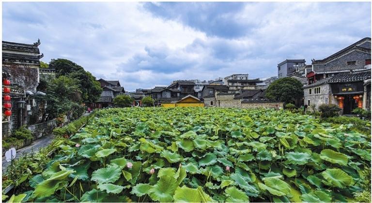若論人間煙火,當(dāng)看吉首乾州古城胡家塘。數(shù)畝方寸之間,荷與明清老宅共呼吸。阿婆臘味的煙熏、書(shū)吧木刻的荷影、彎月下的嬉笑,皆倒映在這方被煙火氣滋養(yǎng)的小塘中。這里的荷,是鄰里搖扇時(shí)的一句閑談,是霓虹闌珊處的一抹溫柔。