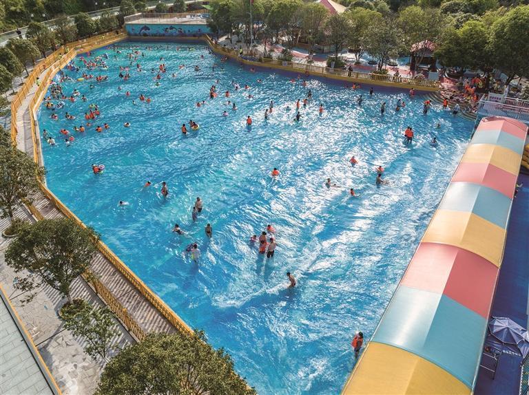 7月7日,吉首市一家水上樂園,市民在水中盡情戲水,享受清涼。當天是小暑節氣,隨著盛夏高溫來臨,游泳場館成為不少市民健身鍛煉、消暑納涼的熱門選擇。