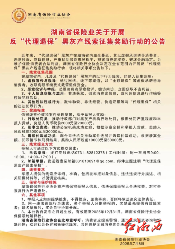 近年來,“代理退保”黑灰產在湖南省內滋生蔓延,其以虛假承諾誘導消費者,惡意投訴、竊取信息,嚴重擾亂保險市場秩序,損害消費者權益,破壞金融穩(wěn)定。為維護保險消費者合法利益,湖南省保險行業(yè)協會決定在全省范圍內開展反“代理退保”黑灰產線索征集獎勵行動,現將相關事項公告如下: