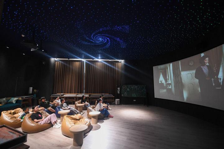 居民在位于杭州市富陽區(qū)銀湖街道硅谷社區(qū)的“合之舍”書房的影視廳內(nèi)觀看電影。該書房是銀湖街道“15分鐘品質文化生活圈”的重要示范點(2022年7月2日攝)。新華社記者 徐昱 攝