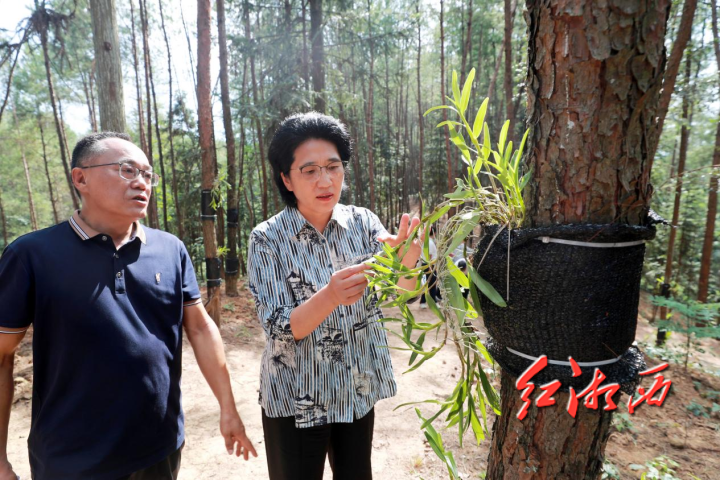 陳華到龍山縣石羔街道興堡中藥材基地調(diào)研林下中藥材種植及生產(chǎn)情況。周興云 攝