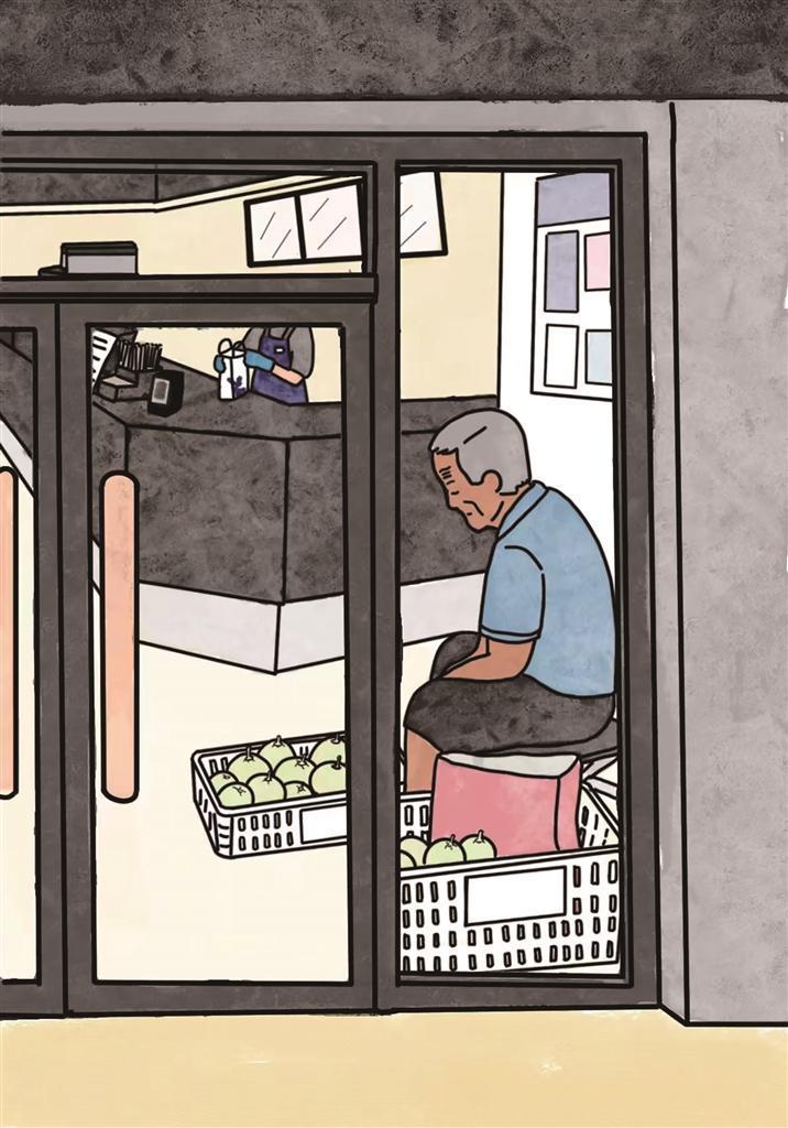 8月3日,吉首一商場(chǎng)咖啡館,賣(mài)香瓜的老爺爺在打盹。(根據(jù)網(wǎng)友視頻繪制) 楊岳 繪