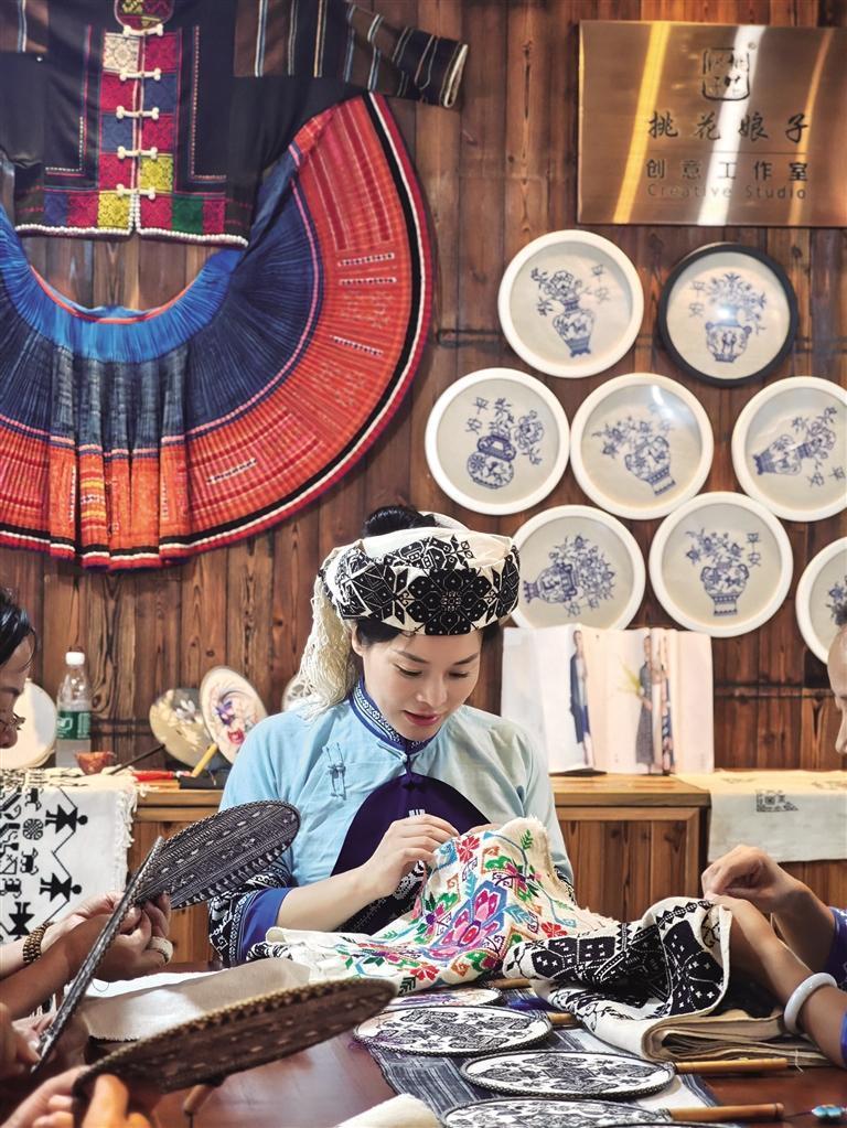 在非遺傳承的路上,滕靜蓉既是守藝人,也是革新者。她的公司將手工苗繡做成日常生活中能用到的家居靠墊、挎包、領帶、香包、公仔、方巾、百褶裙,或嵌入胸章、首飾、茶盒、眼鏡盒里,以滿足消費者不同方面的生活需求。從指尖到生活,從傳統到實用,每一件產品既藏著對苗族文化的深情守望,又飽含對生活美學的鮮活詮釋,讓苗繡成為“看得見、摸得著、用得上”的跨界“爆款”,一時間供不應求,也為繡娘們帶來了月均3000元的額外收入,走上致富路,實現文化傳承與鄉村振興的雙向賦能。