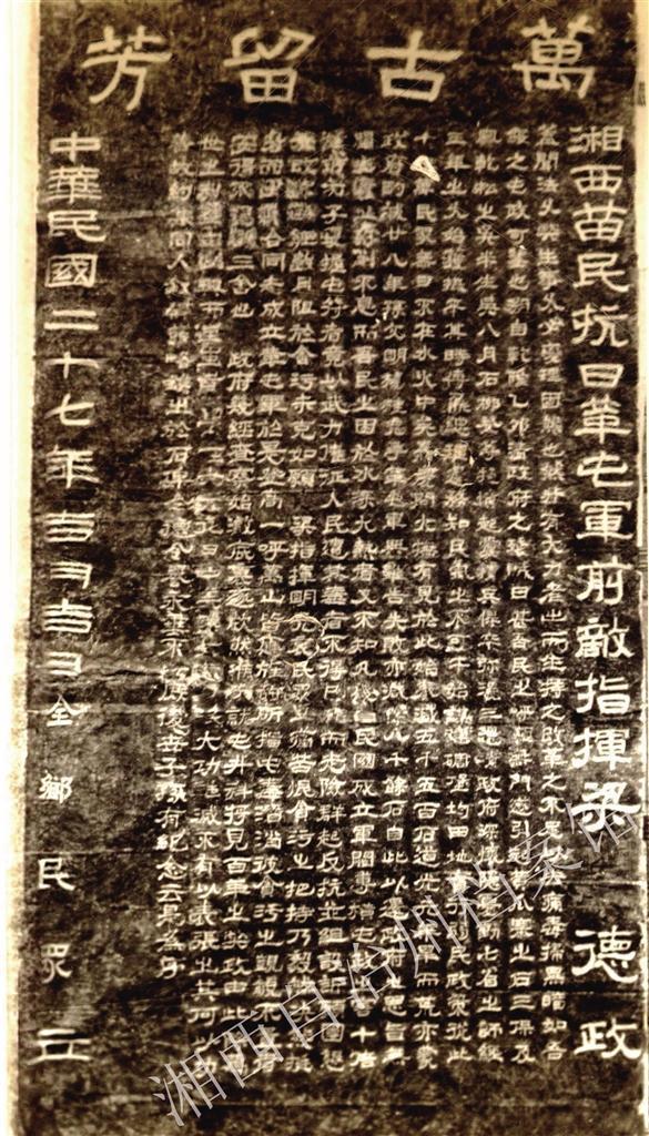 1938年,湘西苗民抗日革屯軍德政碑。由湘西長樂鄉(xiāng)(今花垣縣長樂鄉(xiāng))全體鄉(xiāng)民集資修建,以紀(jì)念革屯抗日運(yùn)動(dòng)。(湘西州檔案館存有數(shù)字化副本)