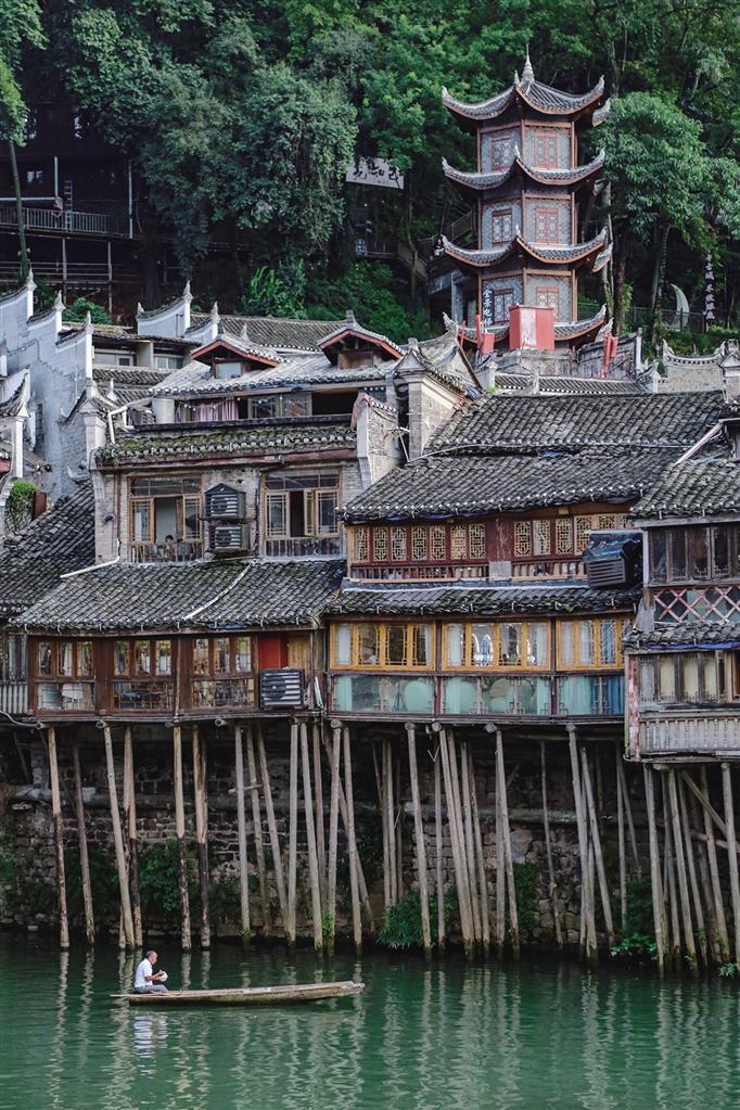 一葉扁舟在沱江上緩緩而行,與身后的吊腳樓相映成趣。