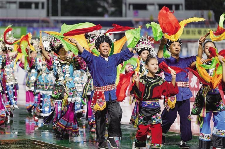 盡管秋雨綿綿,但現(xiàn)場(chǎng)氣氛熱烈非凡。賽前,“鳳凰騰飛”特效表演點(diǎn)亮夜空,富有土家族、苗族特色的方陣隊(duì)伍輪番上場(chǎng),苗鼓、武術(shù)、噴火表演瞬間引燃看臺(tái)激情。