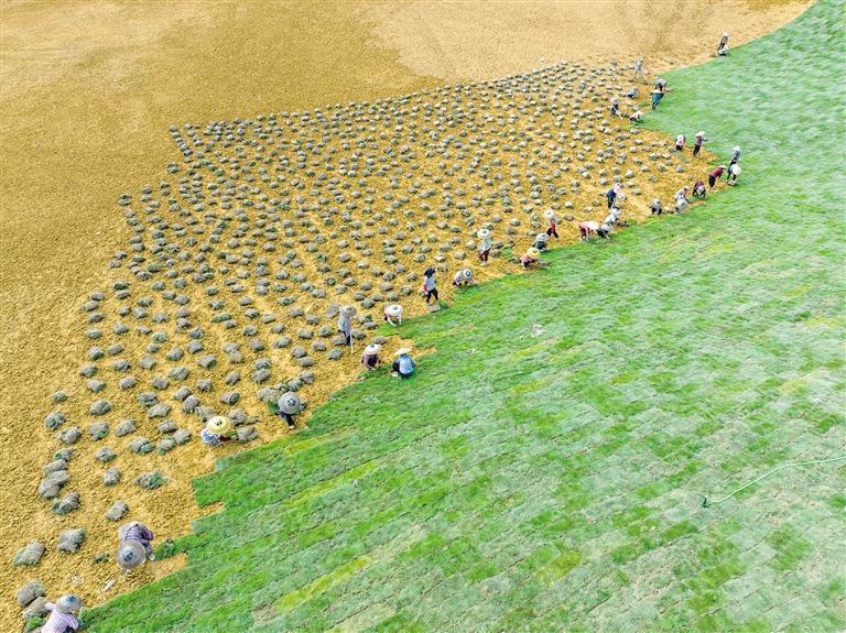 9月15日,吉首市乾州街道兔巖社區,工人正在忙碌鋪設草皮。近日,該街道利用百余畝閑置土地推進“城市草地”建設,打造集休閑、觀光、健身等功能多樣的“口袋公園”。項目建成后,將為市民增添更多綠色休閑空間,提升城市品質和群眾的獲得感與幸福感。 彭璟 攝