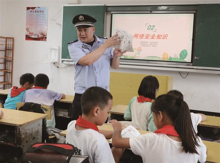 9月16日,保靖縣公安局民警在毛溝小學給學生講解網絡安全知識。連日來,該縣公安局組織民警深入各中小學開展網絡安全宣傳進校園活動,通過現場演示、互動體驗、知識問答、發放宣傳冊等形式,普及網絡安全知識,引導學生增強防范意識和技能。 俞采華 佘高衛 攝