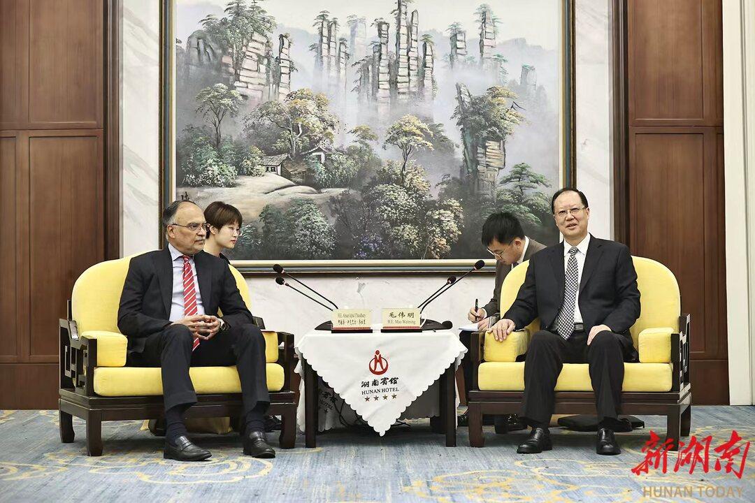 毛偉明對客人來湘訪問表示歡迎,并簡要介紹湖南經濟社會發展情況。他說,近年來,湖南深入貫徹習近平總書記關于湖南工作的重要講話和指示批示精神,認真落實兩國元首達成的重要共識,積極融入共建中巴經濟走廊“2.0升級版”,雙方人文交流密切頻繁、經貿投資務實推進、教育醫療合作深入。去年,雙方進出口總額達18億元,14家湖南企業在巴投資;今年上半年,巴方來湘游客達2373人次,同比增長92.6%;近1300名巴基斯坦學生在19所湖南高校深造。希望雙方攜手融入共建“一帶一路”,進一步深化中巴經濟走廊合作,拓寬經貿交往渠道,加強農業合作,促進人文交流,為加快構建新時代更加緊密的中巴命運共同體作出積極貢獻。