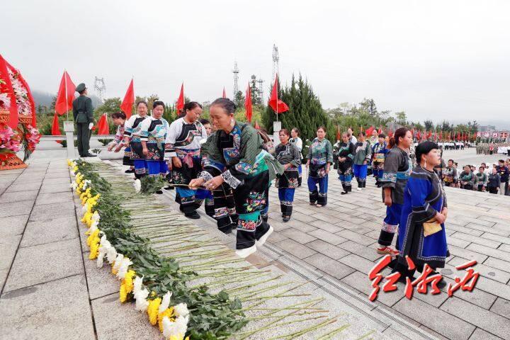 方陣前,以州委、州人大常委會、州政府、州政協、吉首軍分區,吉首市委、市政府以及社會各界名義敬獻的7個大型花籃依次排列。花籃紅色緞帶上,“烈士永垂不朽”金色大字熠熠生輝。
