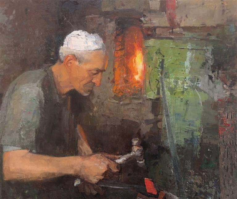 近期創作的大型油畫《鐵火焠心》,集中體現了其藝術理念。作品以一位躬身勞作的老人為核心意象,背景則突破寫實場景的限制,運用熾熱的橙紅色塊與沉靜的灰綠色域交織并置,營造出火焰躍動與大地呼吸般的超現實意境。藝術家通過象征性的色彩組織,將勞動場景提升為蘊含精神性的儀式化圖景。