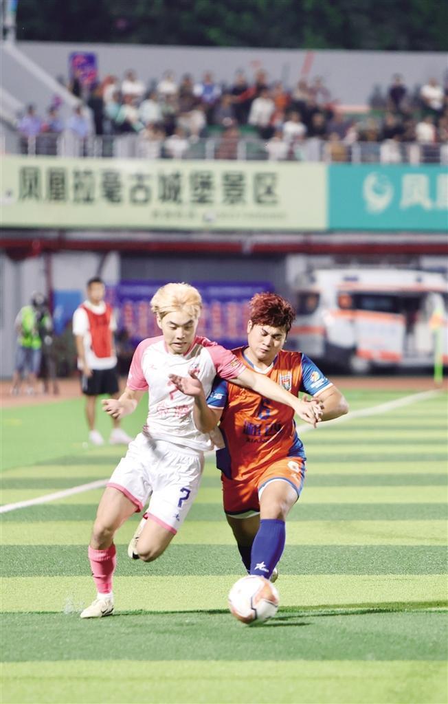 10月11日晚,鳳凰縣民族體育運(yùn)動(dòng)中心的看臺(tái)上,湘西的火紅與常德的緋粉翻涌交織,將秋夜點(diǎn)燃。