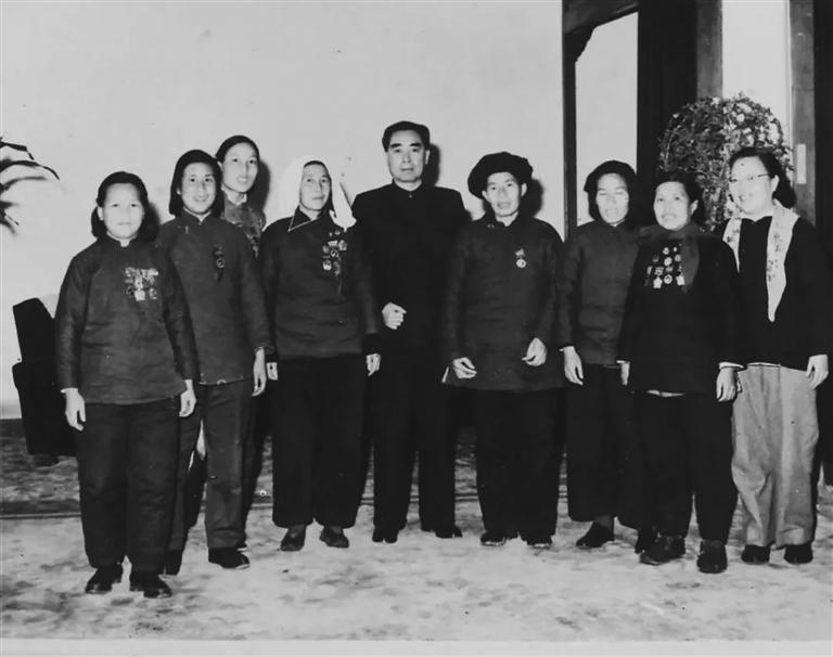 1958年12月楊玉翠(右四)參加全國婦女建設(shè)社會主義積極分子代表大會受到周總理接見的合影。