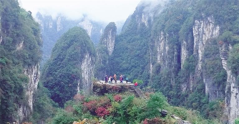 11月7日,雨后的吉首市德夯大峽谷愈發清麗秀氣,云霧纏繞在奇峰、峽谷之間,縹緲翻飛,宛如仙境,讓人迷醉其中。圖為游客在天問臺拍照、游玩。 團結報全媒體記者 石秋云 攝