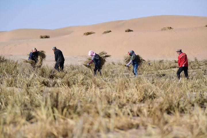 2025年2月28日,在巴丹吉林和騰格里兩大沙漠交匯處的阿拉善九棵樹項目區,治沙工人用稻草在沙漠中扎草方格。新華社發(康文魁攝)