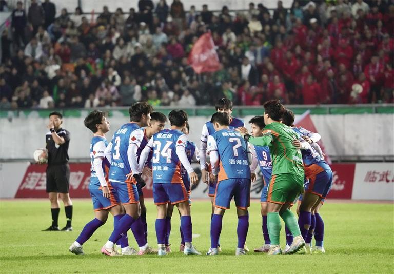 11月21日晚,“湘超”第十一輪,湘西隊客場挑戰郴州隊,湘西隊球員圍成一圈互相加油打氣。 團結報全媒體記者 胡承鼎 攝