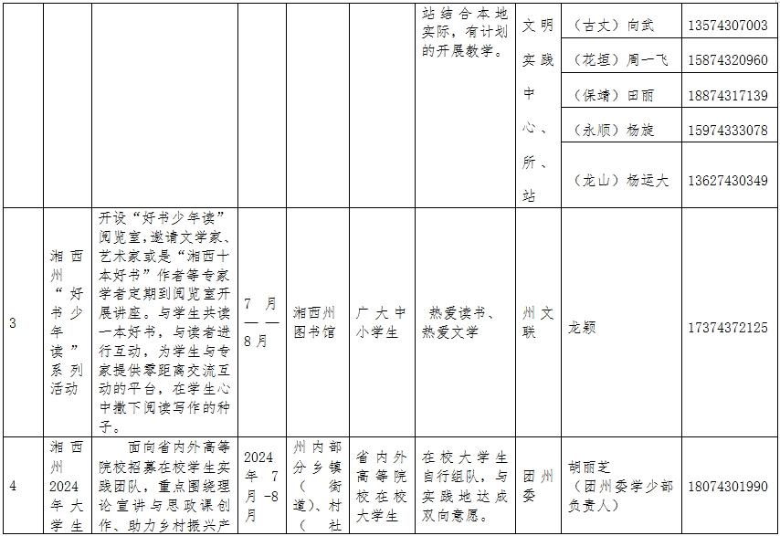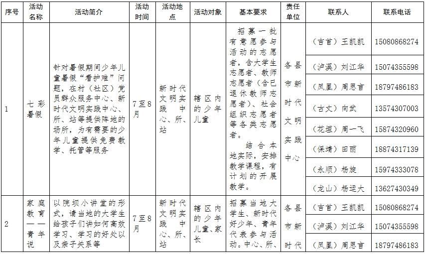 為全面貫徹落實(shí)好中辦印發(fā)的《關(guān)于拓展新時(shí)代文明實(shí)踐中心建設(shè)的意見》,積極培育和踐行社會(huì)主義核心價(jià)值觀,進(jìn)一步引導(dǎo)和幫助學(xué)生度過一個(gè)安全、快樂、有意義的暑假,現(xiàn)將湘西自治州2024年“暑假友愛·文明同行”文明實(shí)踐部分項(xiàng)目予以公告,供各級(jí)各類文明實(shí)踐參考。